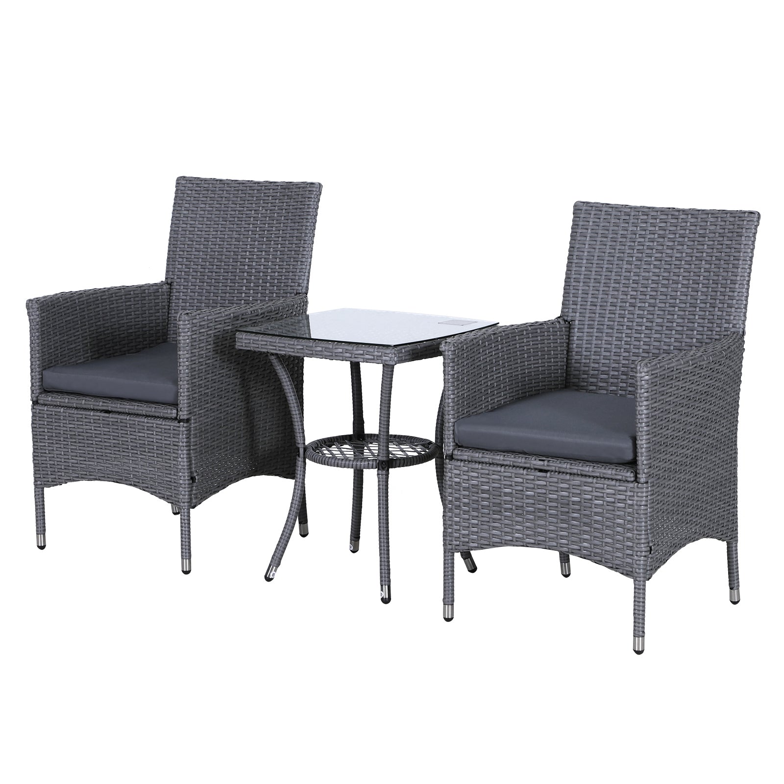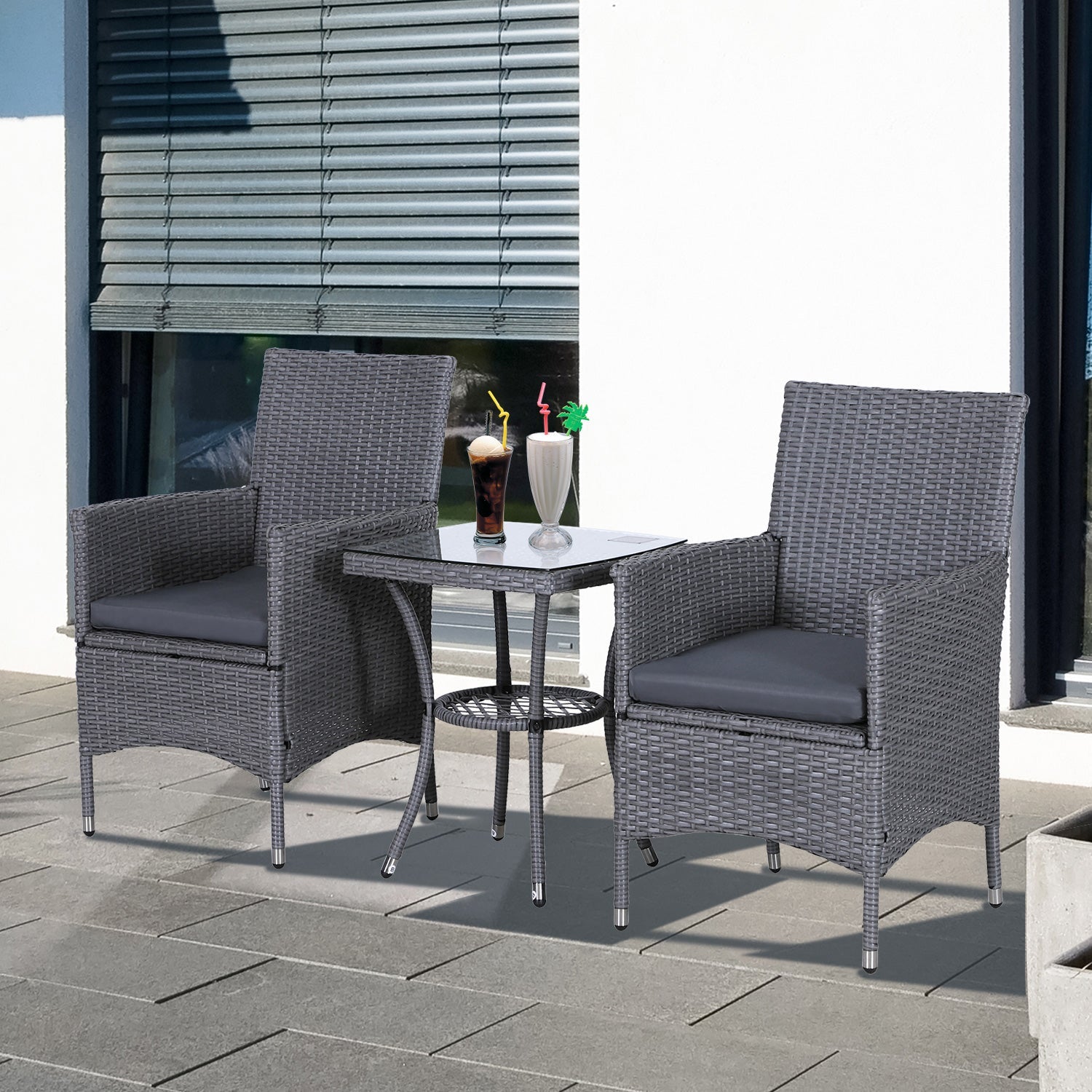 - Set comes with two garden chairs and matching side coffee table