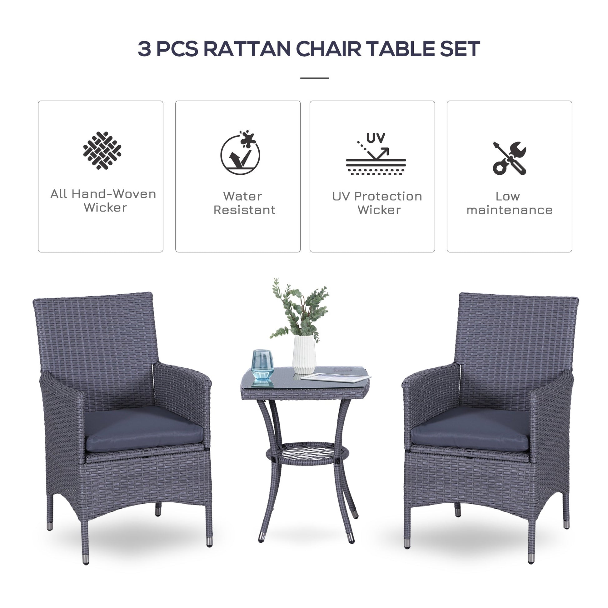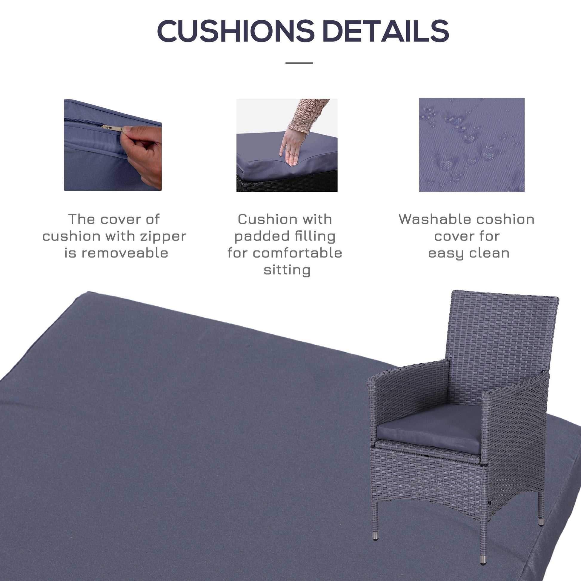 - Comfortable cushions: The garden bistro set for 2 with deep armchair with soft padded cushion to provide cosy sitting experience. Covers are removable and machine washable.