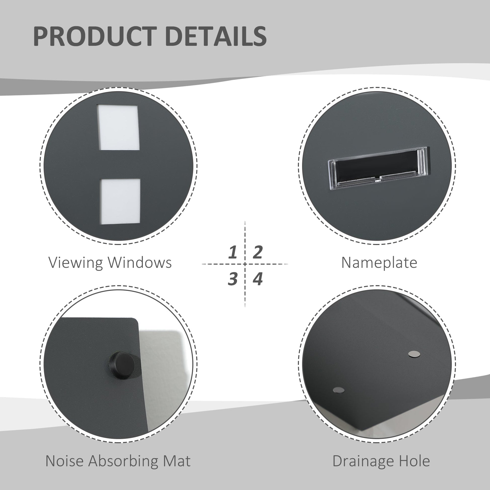 - Considerate details: The modern mailbox is fitted with little pads on the cover plate to avoid noise when closed, and equipped with leak holes at the bottom to prevent water accumulation when outdoor using.